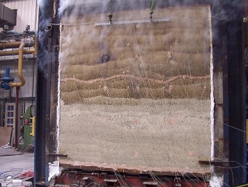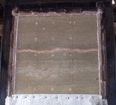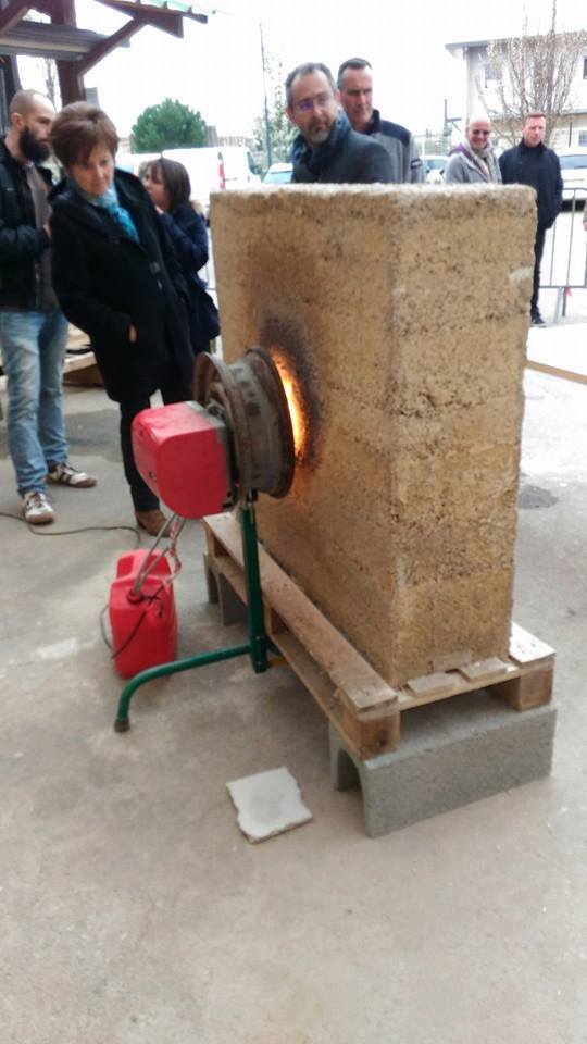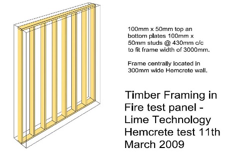 Tesztfal 3m x 3m x 300 mm. 135KN erőhatásnak tették ki, folyamatos lángterhelés mellett. Egy pár képen látható a vizsgált kenderfal.